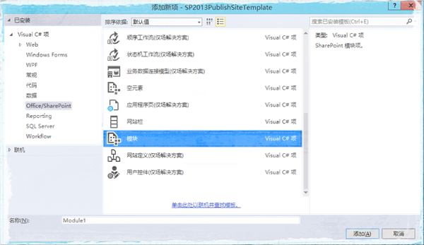 开发站点模板,首先要创建一个母版页,也就是在创建SharePoint空解决方案之后,添加一个新项,项目为模块,如下图: