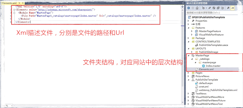 如下图,添加母版页目录结构,修改模块的Xml内容,Path也就是文件路径,是解决方案中文件的路径,Url是链接地址,是将来发布到SharePoint站点的地址,通常,我们都会复制一个SharePoint已存在的母版页,来修改成我们需要的样子:
