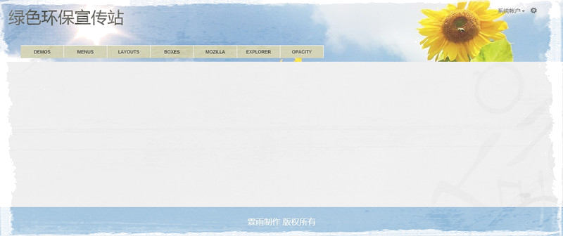 如下图,是Div+CSS布局的母版页,主要包括头部、中间内容、尾部版权信息三个部分。而头部还包括网站名称、导航、用户、网站设置几个控件。