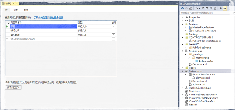 相比之前介绍的内容,可视化webpart就非常简单了,创建三个可视化webpart,分别用作图片轮播、文字新闻列表展示、文字新闻More页。