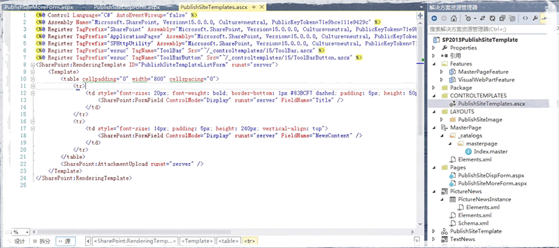在Pages映射的文件夹中,添加两个页面分别用来定制DispForm和More页,添加一个模板的ascx控件,用来展示DispForm页面。由于More页和SharePoint原来页面相差很大,所以我选择开发一个可视化webpart,并不需要修改模板,只要隐藏掉之前的模板即可。