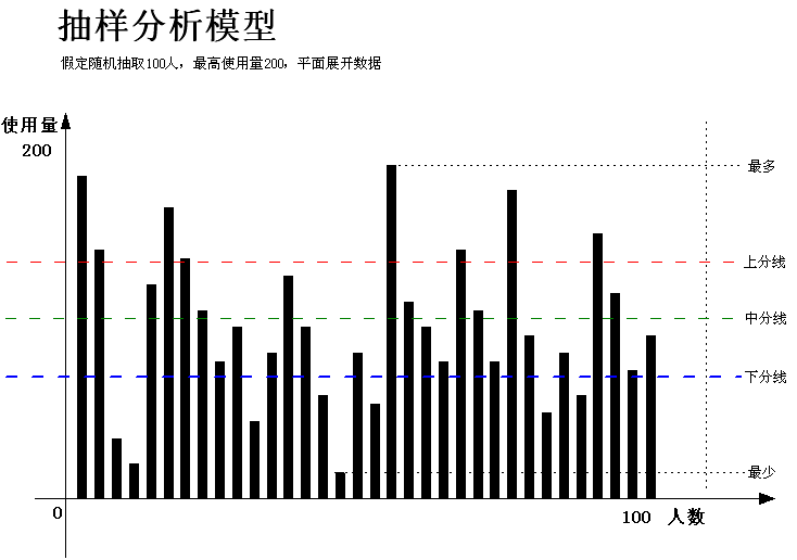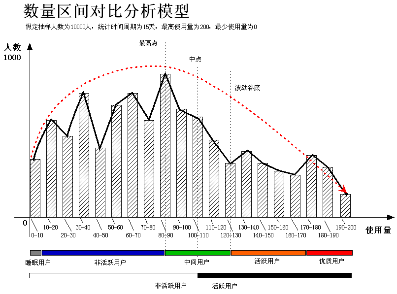 |           在上一篇《用户推广的差异化策略》中提到:要执行差异化策略,首先要做到用户的差异化,不把信息投送的对象搞清楚,所谓的差异化就无从谈起了。那么,首先要做到了解用户、认识用户。          在开始进行用户分类之前,面对的是一个未知的数据库,不知道哪些人使用得多?哪些人使用得少?多的多多少?少的少多少?多多少才算多?少多少才算少?不把这些概念转化成准确数据支持的清晰认识,就不可能把握产品运行和用户使用的现状,也就无从制定产品研发和运营推广计划。解决上述问题,就需要通过开展基础用户数据统计分析。          怎样开展基础用户数据统计分析?以得到分类用户标准和宏观认识?可以采取模型分析法。以下以某网络软件为例开展分析,列出了两种可选的分析模型:          说明:潜在用户不需要通过模型分析,而是通过市场调查和产品定位分析获得;     新注册用户通过设定成为注册用户之后的时间限制,确定身份。在抽样之前首先把新注册用户剔除。    一、抽样分析模型                   建模方法         首先确定统计的时间段,暂定为15天;从数据库中随机抽取若干名用户作为分析样本建立分析模型,模型图中假定抽样人数为100人,15天内最高使用量为200最少为15,在横坐标轴依次画出每人的使用量立柱图;然后向右侧画出最高点和最低点的水平引线;然后垂直划线连接水平线,得到上下交点之间的线段,分别在线段的中点和三分点处水平画出“中分线”“上分线”“下分线”;        分析方法        根据立柱图的分布比率确定哪条线为“多”“少”的分割线;        1、高柱和低柱比较均衡,则以中分线为分割线;        2、普遍偏高,少量低柱,则以上分线为分割线;        3、普遍偏低,少量高柱,则以下分线为分割线;                  优点:统计建模方便快捷;          缺点:不能获得准确的宏观数据,仅获得近似的参考数据。    二、数量区间对比分析模型                   建模方法         假定统计时间段为15天,抽取10000人,分别统计他们的使用量,假定最多使用量为200,最少使用量为0;模型的横坐标为使用量,纵坐标为发送人数;在横坐标上,以10条为量级,从少到多依次画出不同数量区间的发送人数立柱图,连接主图顶部重点,得到人数波动曲线。          分析方法         1、波动曲线的顶点和与顶点最近的最低点,即为使用量“多”和“少”的分水岭,连接两点,取中点画垂直线,即得到二分法的临界线,左侧为非活跃用户,右侧为活跃用户。如图示          2、根据柱状图在不同量级的分布状况,也可以采用多分法细分用户类型,如图示    三、对比分析模型曲线类型分析        利用“数量区间对比模型”分析,不仅能得到分类用户量级标准、人数、和使用量数据,通过分析使用量曲线类型,可以得到产品和运营的宏观印象。以下对四种典型的曲线类型进行分析。                           |                |                  |            常见状态(产品研发和市场发展的初期) l 有基本稳定的用户群 l 缺少优质用户,拔高乏力 l 缺少高粘度产品(功能) l 基本功能还行,除了基本功能,别的不爱用  |                  维持状态(市场发展中后期) l 通过若干时间的经营,产品有一定影响,同时拥有少量fans l 对初级用户的引导不够,致使中间用户空虚 l 产品本身或有某种缺陷,不为多数人接受,只有少数人突破瓶颈,习惯产品才成长成高级用户  |                           |                |                  |        理想状态(初、中、后期)                 1 市场发展势头良好,用户上手快,越用越熟练,越用越喜欢                 2 证明产品功能,用户教育俱佳                 3 需加大对潜在用户的宣传力度,扩大用户数        |              严峻状态(初、中、后期)                 1 市场发展形势不客观,用户浅尝辄止,流失严重                 2 产品存在重大缺陷或基本功能设计实现欠佳,无法留住用户                 3 宣传引导力度不够        |                  |