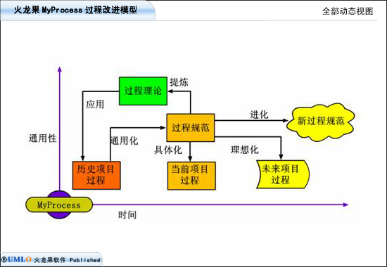 | MyProcess首先强调关注当前组织中过程的问题,为了避免什么都改进,什么都改进不了的尴尬局面,把过程的问题具体化为项目中的过程问题,首先对项目进行历史再现,然后进行深入的诊断,发现问题,改进问题,把改进好的过程应用于新的项目,对于有普遍意义的实践提升为规范,然后再对规范理论化,形成过程理论。 过程改进涉及到软件工程组织的工作方式、方法和环境的改进,尤其涉及到人员观念和工作习惯的改变,客观的说不应该是一个急进的过程,而是一个结合组织当前的过程问题,逐步改造的过程,所以过程改进模型应该提供一个具体的演进的路线图,而这个演进的路线图可以像CMMI那样分为多个级别,然后逐步改进,但是分级的问题就是对客户的问题进行了主观的分级,虽然这也是基于大量的过程经验得出的,但是很难一下适应客户当前改进的需要,因为改进可能并不是组织当前最关键的目标,一般是辅助或者支持性的目标,所以改进的过程模型应该有另外一种层次出现:不局限于具体的过程域,而强调一种基本的过程改进方式,MyProcess正式关注于这个方面,可以带来一个更灵活和客观的思路。 这样说并不是说CMMI,RUP,XP是无效的过程或者过程改进模型,这些将是我们宝贵的工程资产,在改进过程中,对于面向特定问题的时候,我们依然可以从以上的过程中获得参考。 过程实践-过程规范-过程理论,三者循序发展,互相促进,最重要的,是使改进者在不断的问题改进过程中享用改进带来的价值,而不是长期迷失于改进所带来的痛苦。 MyProcess已经经过多个真实的客户的实践案例,证明 “真正有效的过程改进”将不再是先知们的梦想。我们确信,通过我们与您得的共同努力,一定能够建立适应您的软件开发过程,它将不会仅仅作为一个花瓶,您所得到的,将是一个真正的利器。 作为软件团队的原动力,随着软件规模的扩大,软件过程成为制约项目和产品成败的决定性因素之一,日益开发团队和客户方的重视。如何有效地改进软件过程,成为必须要解决的关键问题。只有积累软件过程改进经验,集成技术与管理为系统的软件过程方案,通过基于实践的软件过程改进方法,您一定能够有效地进行软件过程改进。 为了把错综复杂的过程元素整理清楚,在MyProcess过程构建过程中,我们采用对象模型分析了过程模型,过程元模型如下:  图2:火龙果MyProcess过程元模型 其中元素说明: - 人员:过程中的具体工作人员,例如:张三,李四,王五。