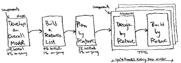 需要注意的是:上述Coding的过程中还包含有单元测试的内容。此外单从DBF/BBF的过程来看,设计所有的时间要比编码的时间长(40% : 45%),但考虑到FDD的整个实施过程(包括前期的建模过程),设计的时间还是比编码的时间要长的(45% : 35%)。